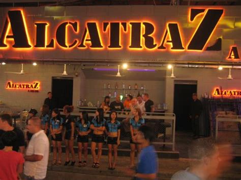 • Alcatraz is a prison-themed go-go bar / nightclub, known for a multi-level layout (three floors) with prison/cell decor, caged dancers on mezzanine levels, DJ and laser light shows — large interior and club vibe.